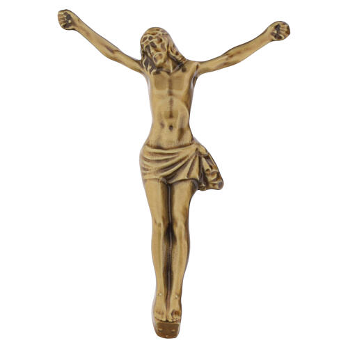 The composition depicts Christ with outstretched arms and an elongated body, modelled in relief with essential anatomical definition and continuous bronzed surfaces suitable for application on vertical supports.