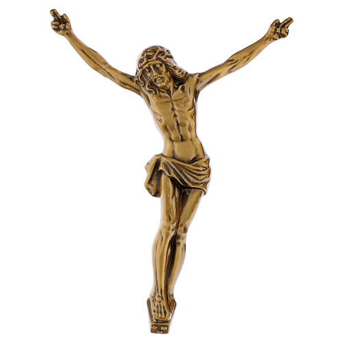 Sculptural depiction of the crucified Christ, designed for wall installation and made in metal with a protective bronze finish.