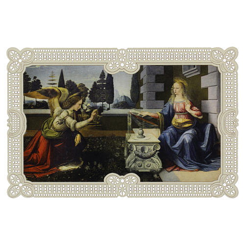 Holy card depicting the Annunciation, inspired by Leonardo da Vinci's masterpiece; the Archangel Gabriel and the Virgin Mary are portrayed in a solemn, spiritual moment.