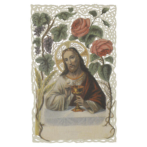 Holy card, Jesus with chalice and Eucharistic symbols, 5x3 in, lace-edged