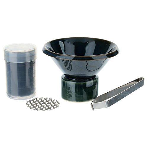 This kit includes a dark blue ceramic incense burner, measuring 2.8-inch in height and with a plate diameter of 3.8 in. The burner comes complete with a 1.6-inch circumference metal grid, 5 charcoal tablets, and a practical tong for safe charcoal handling.