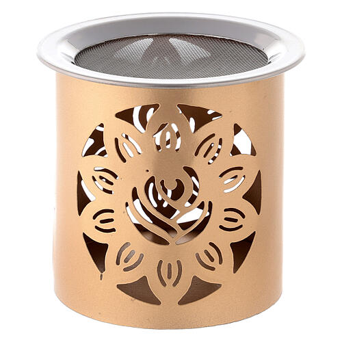 Incense burner with cut-out flower, golden metal, 9 cm. Cylindrical incense burner made of golden metal with two cut-out round sections representing a flower.