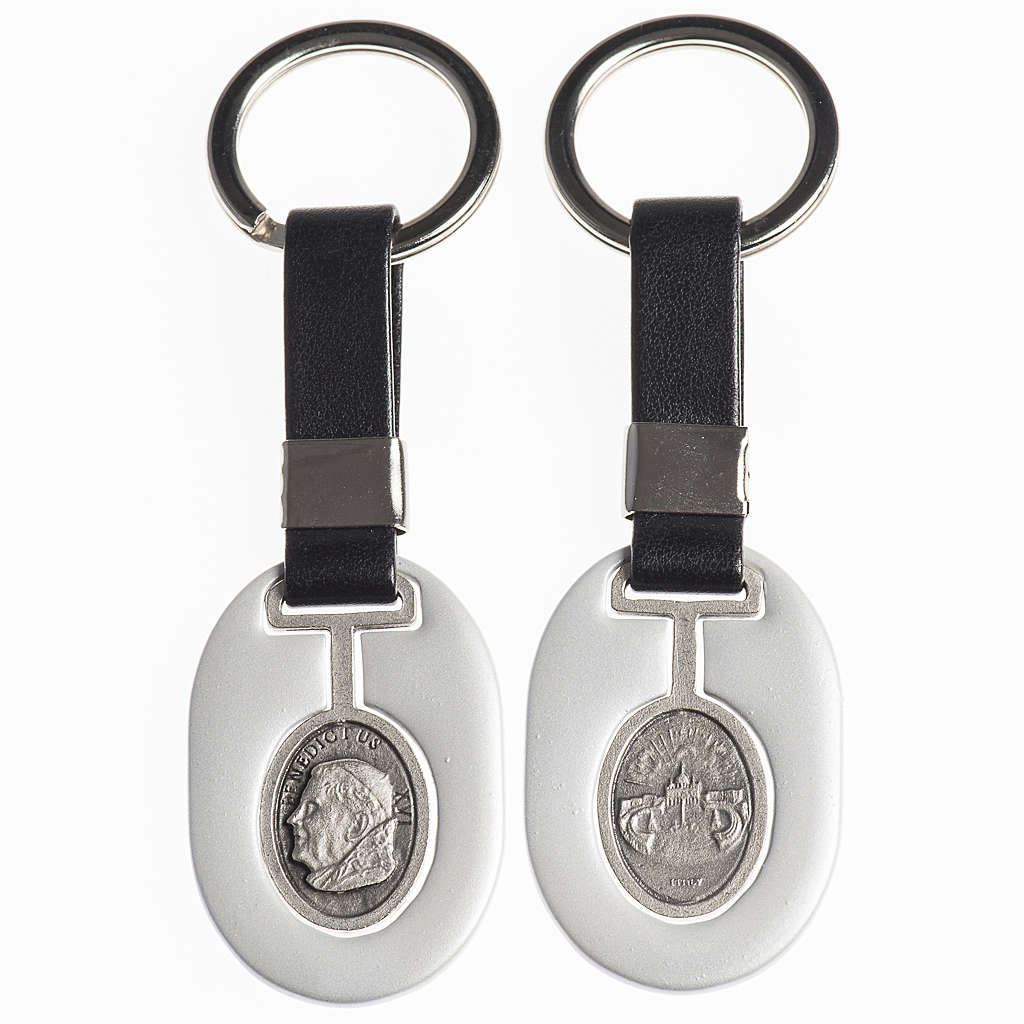 Keychain Pope Benedict XVI in white antique silver and fake black leather.