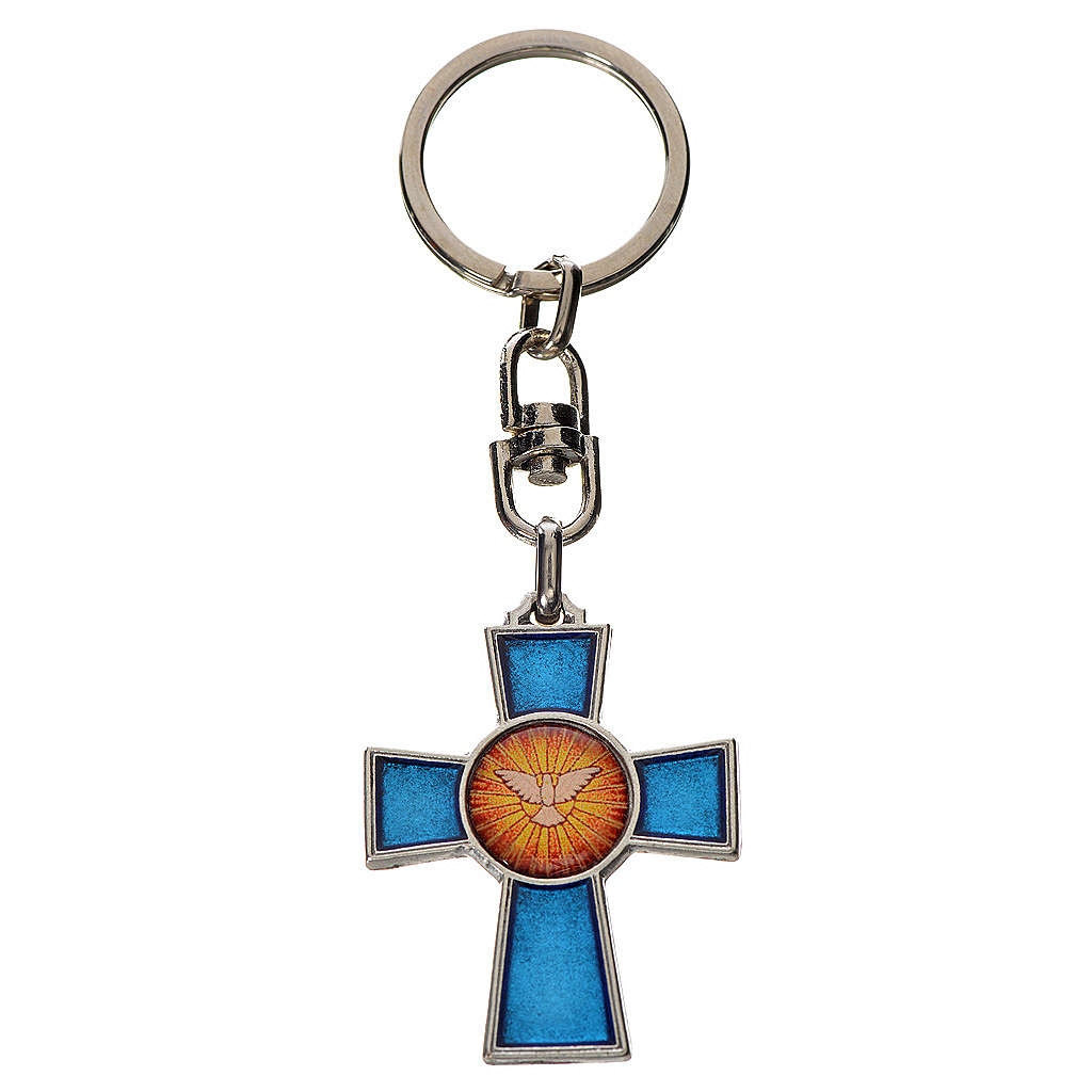 Keychain with Holy Spirit cross medal, zamak and blue enamel measuring 3.5x3 cm of diameter.