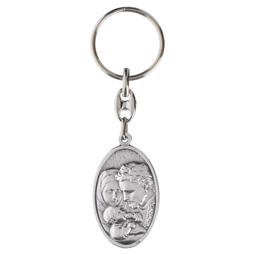 Keyring with a 1.8x1 in oval medallion depicting the Holy Family in relief on the front and the Holy Spirit on the reverse.