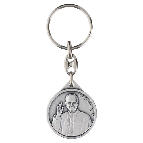 Religious keyring measuring 3.15-inch in total length, featuring a 1-inch round medal depicting Pope Leo XIV on the front and St. Peter's Basilica on the reverse; entirely made of silver-plated zamak.