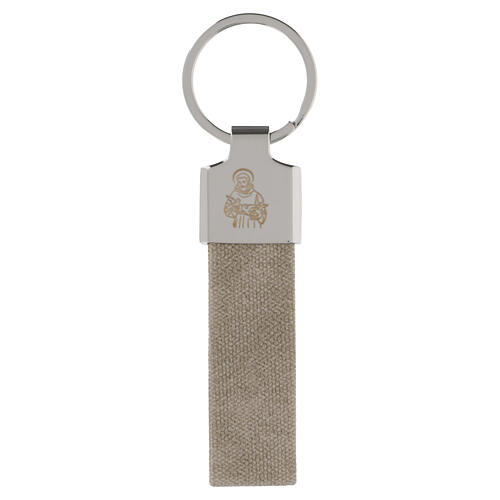 Key ring with metal split ring and an upper plate engraved with St. Christopher, paired with a linen-effect beige fabric band.