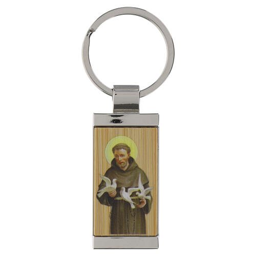 St. Francis rectangular metal key ring with wood-effect finish.
