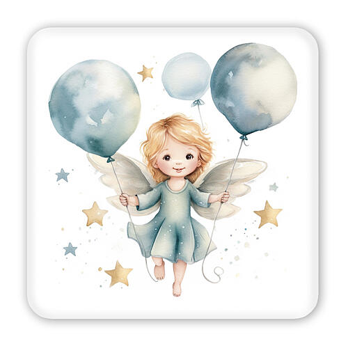 The image features a tenderly depicted angel holding balloons, surrounded by stars, with slightly raised outlines enhancing its quality.
