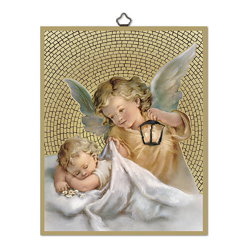 Mosaic picture featuring an angel with a lantern tenderly caring for a child, handcrafted on a wooden base with a captivating golden background.