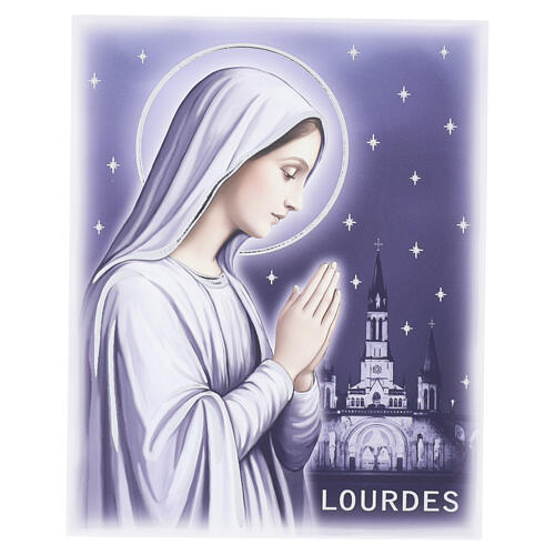 Sacred picture reproduced in high-definition print on white wood. The rectangular composition features cool tones with the figure of Our Lady in prayer, a decorated background and luminous graphic details with the integrated "Lourdes" inscription.
