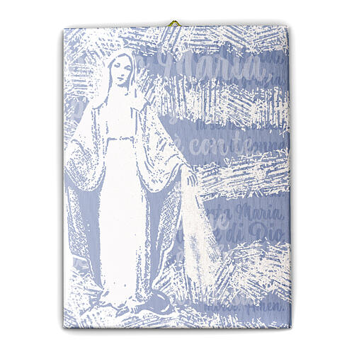 In this canvas, Our Lady of Graces is depicted in close-up, with words in bold and regular font in the background. Against a light blue background, the figure stands out immediately.