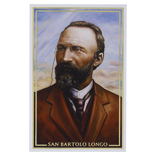 The image depicts Saint Bartolo Longo in a frontal pose, rendered in warm tones with a decorative background and a uniform painted finish.
