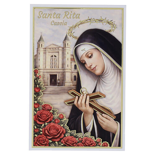 The image depicts Saint Rita in close-up with a slightly inclined face, rendered in delicate tones and enriched with floral and symbolic elements on a light background.