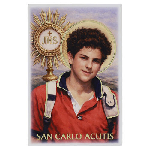 Compact format (3.5x2.4 in) depicting Saint Carlo Acutis in warm tones, enriched by silver-effect decorative finishes on the iconographic details.