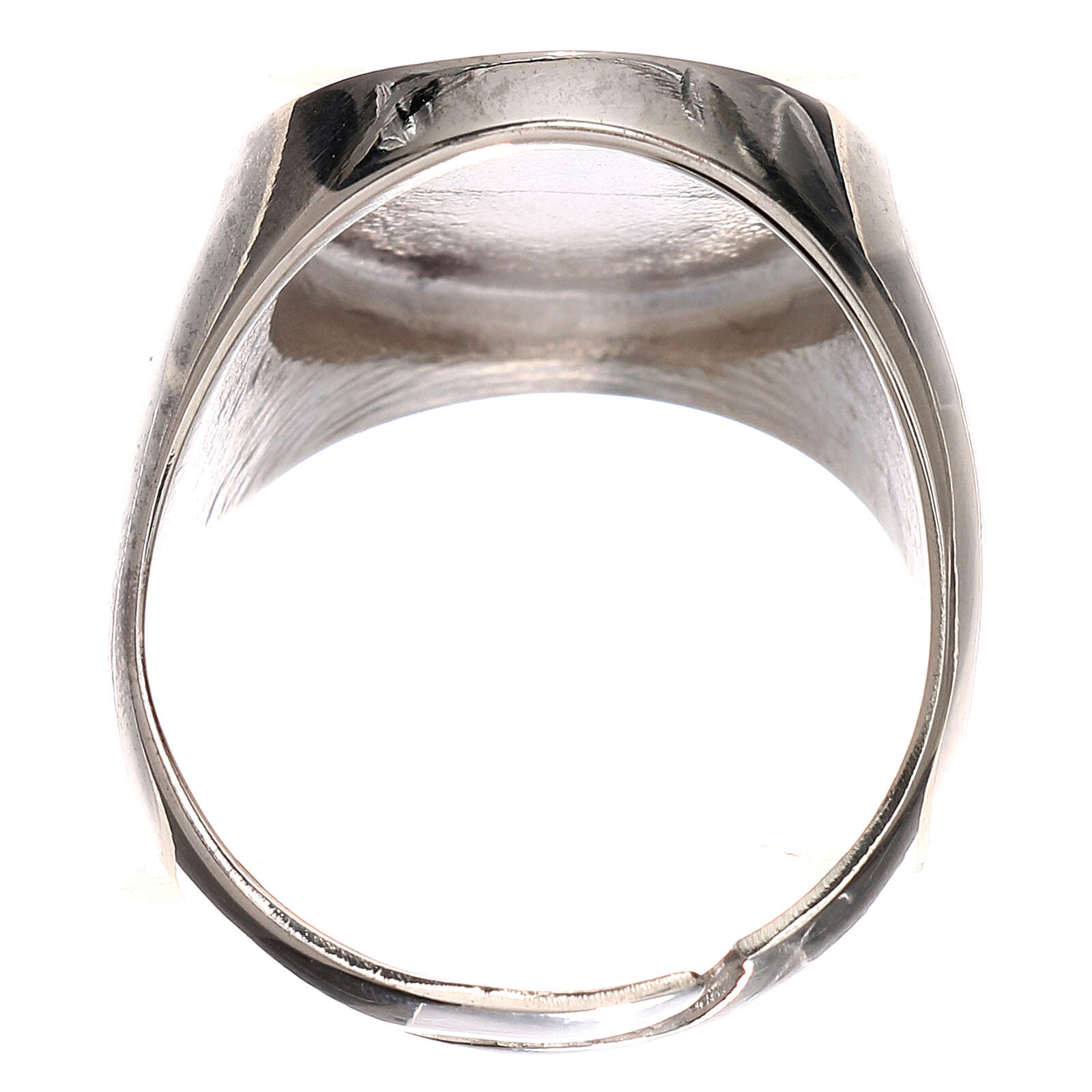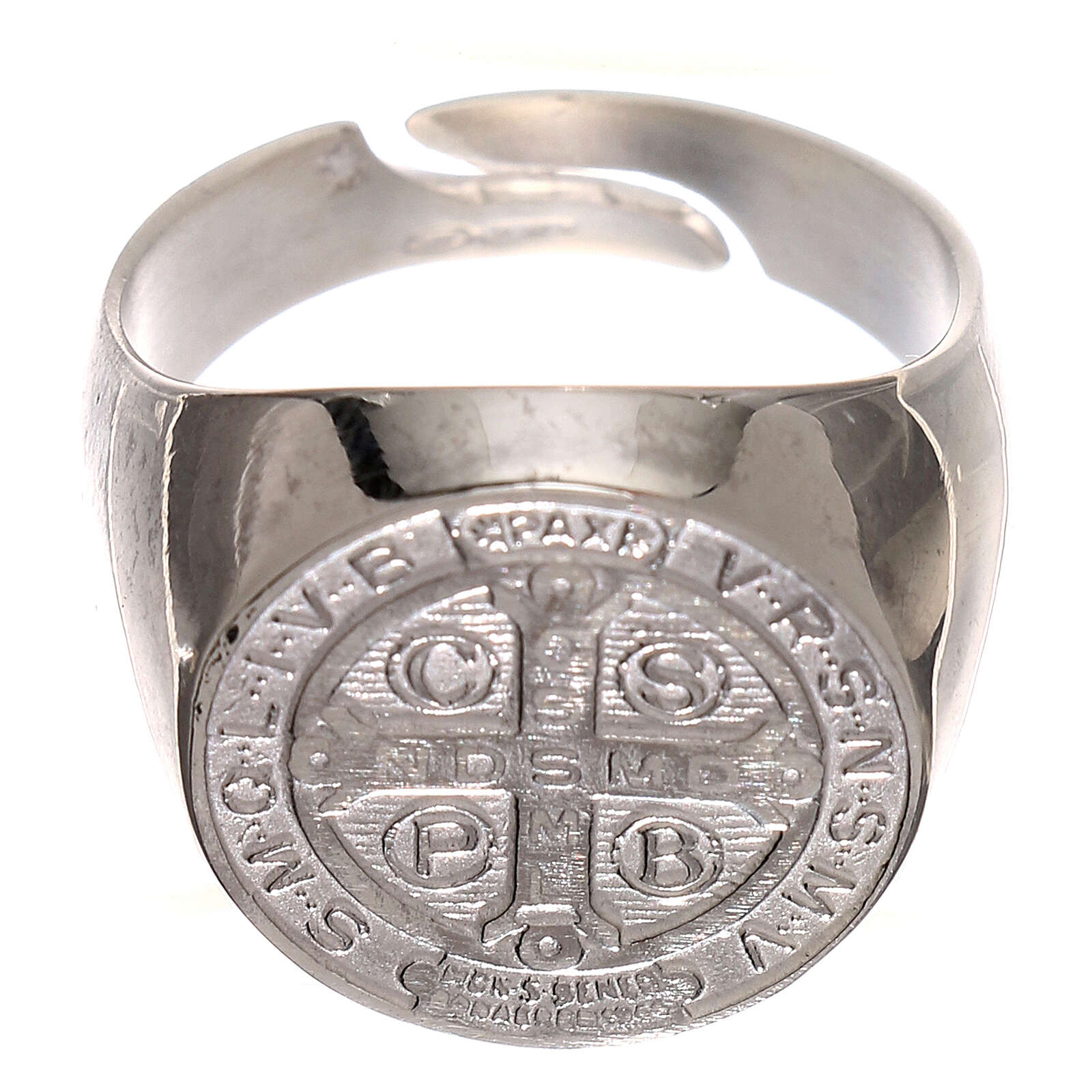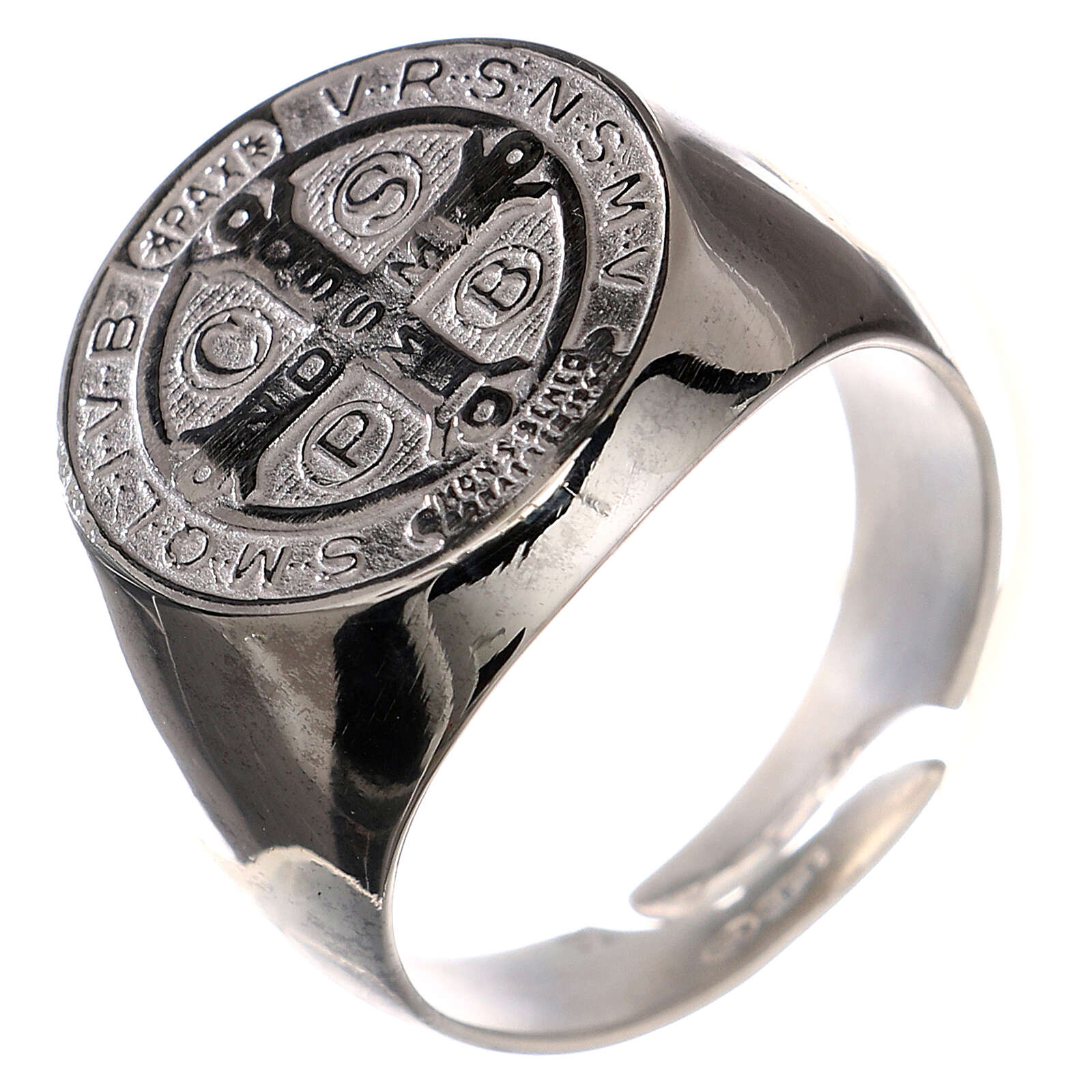 Silver ring with Saint Benedict symbol. The size is adjustable (minimum diameter: 20 mm). The product is entirely made in Italy by a company specialised in silver jewelry production.