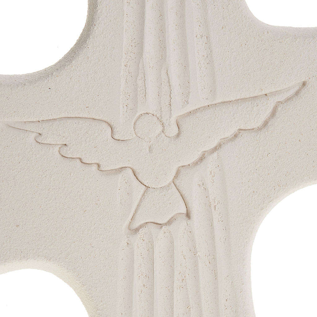 This bas-relief in fireclay features the Confirmation Holy spirit with a dove engraved in the middle. The item is available completely white or white and gold . This stylized crucifix is firstly hand worked, then baked at more than 1000° degrees and hand finished.