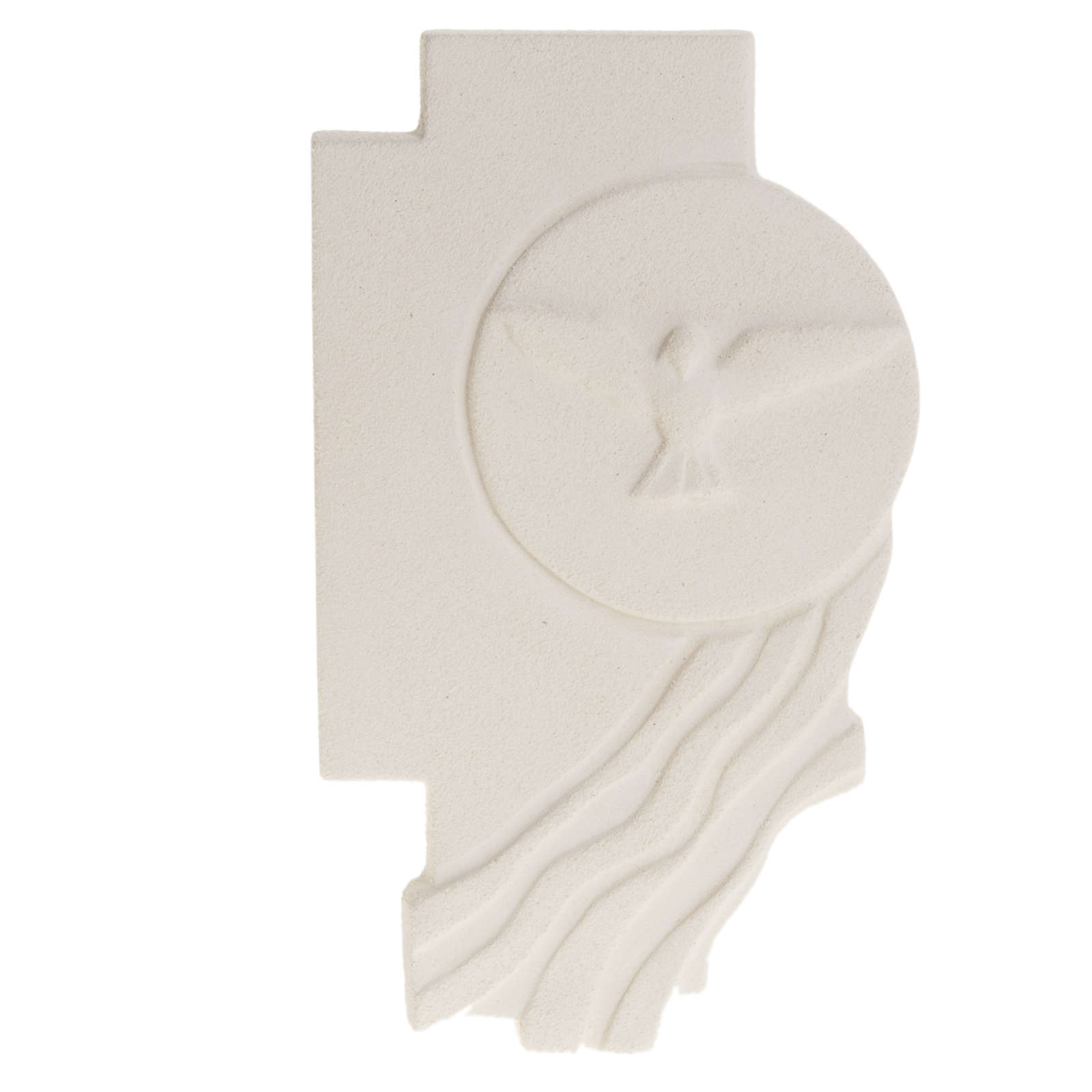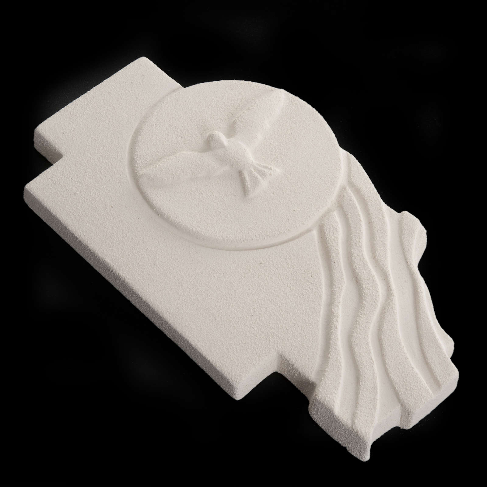 This hand-made bas-relief depicts a fireclay First Communion crucifix with a dove in the circle. This stylized bas-relief is firstly hand worked, then baked at more than 1000° degrees and hand finished.