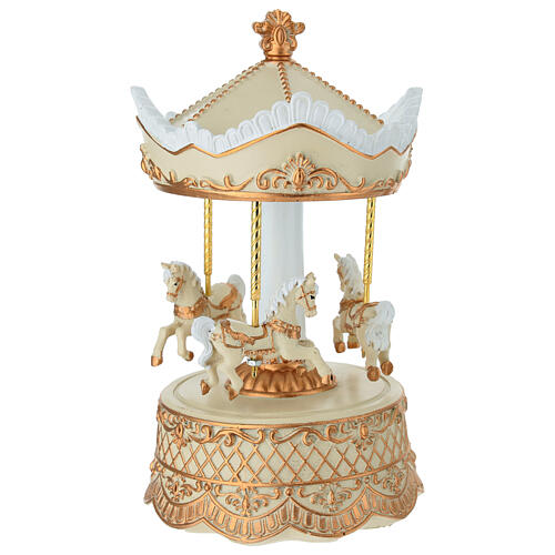 Carousel music box with horses, 8.5 in. Three-horse carousel music box, decorated in beige tones with refined gold and white details. The carousel's height is 8.5 in, while the base circumference measures 4.7 in. Also ideal as a favour, gift idea, or memento of a joyous event.