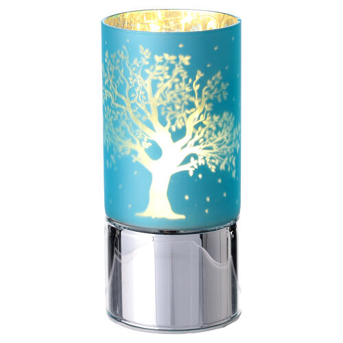 LED lamp of opaque light blue glass with Tree of Life silhouette, favour by Bagutta