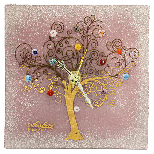 Pink square Murano glass table clock decorated with murrine and a central Tree of Life motif in 24k gold leaf.