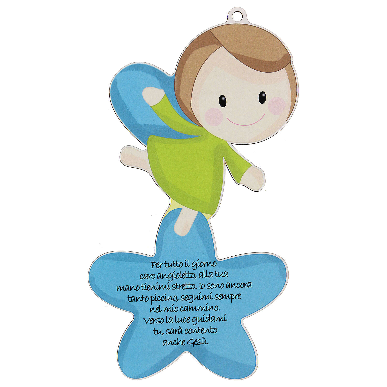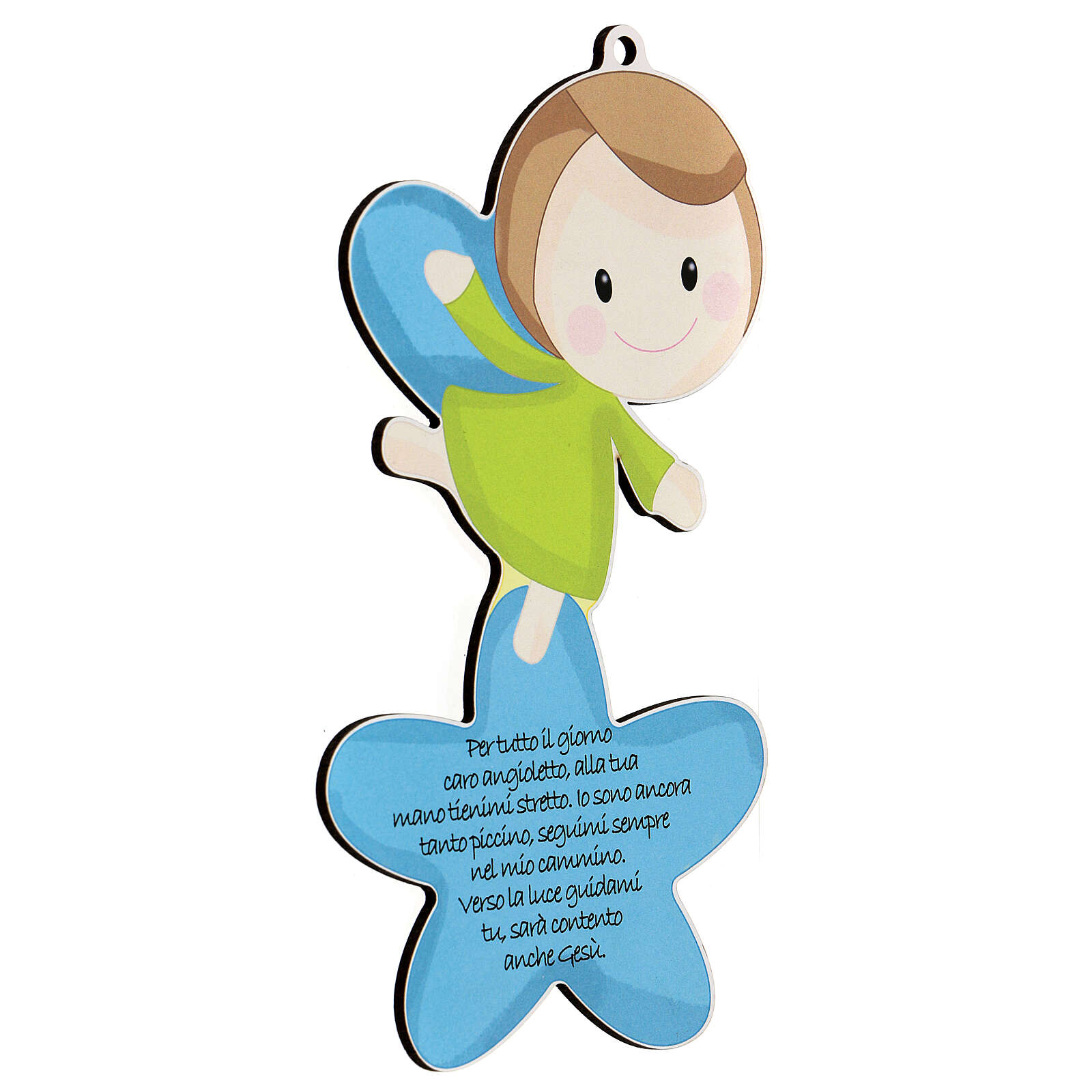 Wooden picture in the shape of angel and star with prayer, made in blue version for children.