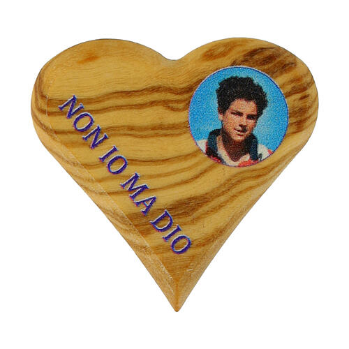 Olivewood magnet, heart with Carlo Acutis' image and phrase, ITA, 1.4x1.4 in. Heart-shaped magnet of olivewood from Assisi, measuring 1.4x1.4 in, characterised by a small photo of Carlo Acutis and by the engraving of one of his most popular quotes in Italian: "Not me, but God".