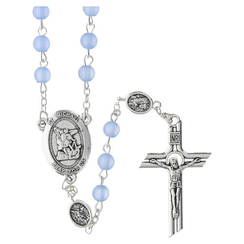 Devotional rosary dedicated to St. Michael the Archangel with 0.24-inch light-blue satin-finish plastic beads and metal components.