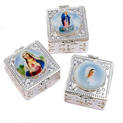 Rosary case box in filigree with porcelain image on its cover, suitable to contain rosaries with max. 6mm beads. Available with three different images: