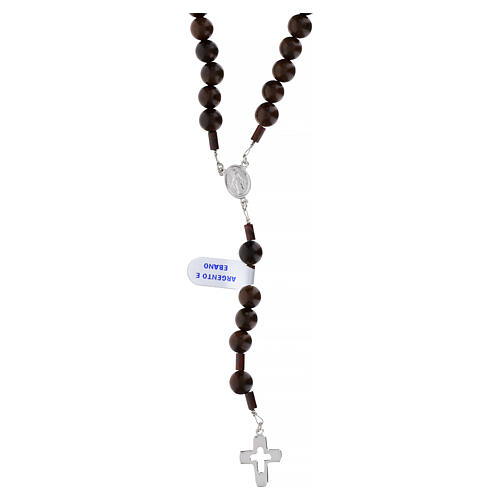 Rosary in ebony with silver cross and center piece. This rosary is made in wood with 8 mm diameter grains. It is enriched by a small cross in 925 sterling silver decorated with the image of Our Lady of Miracles. Snap hook closure adjustable up to 7 cm thanks to the chain. Jewel weight: 22g