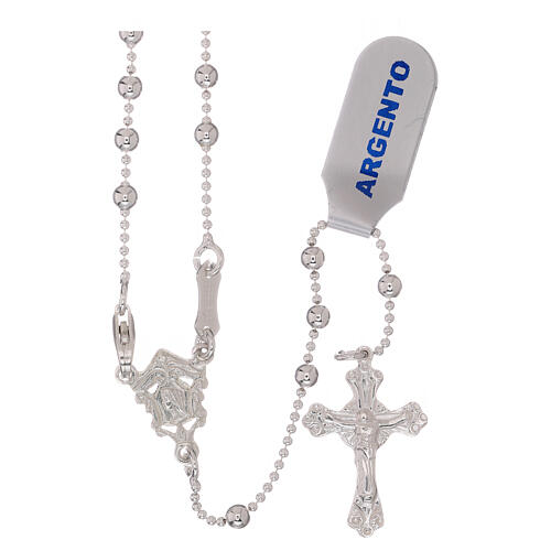 STOCK Rosary necklace of 925 silver, 3 mm beads. Rosary necklace with lobster claw clasp and 3 mm smooth, round, shiny and full beads of 925 silver. The rosary is completed by a budded cross and a decorated medal with the Virgin Mary on one side and Jesus on the other.