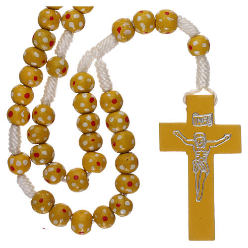 Yellow wood rosary, rope and 7 mm beads. Rosary made of white rope and yellow wood beads of 7 mm with painted flowers. The cross is decorated with a silver printed body of Christ.