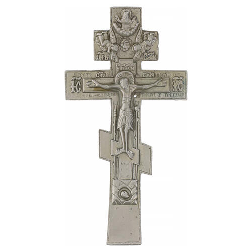 Antique 19th-century Russian Orthodox silvered-bronze crucifix, 8.3x3.9 in.