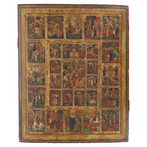 Antique Russian icon, Sixteen Great Feasts and Passion Cycle, 19th century, 19x15 in
