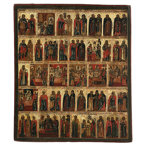 Russian icon, Menology of October, painted in the 18th c., 13.6x11.6 inches. Icon painted at the end of the 1700s in northern Russia with egg tempera on wood, representing the Menology of October.