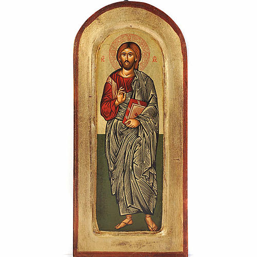 This icon reproduces Jesus as the divine message of God, this icon is characterised by a nimbus with a cross in which you can read the letters O ON (Exodus 3,13,-14). In this icon Christ is depicted with a closed book.