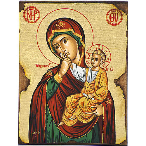 Wooden icon with applied screen-printing representing the Paramithia Virgin also called Mother of God Joy and Relief.