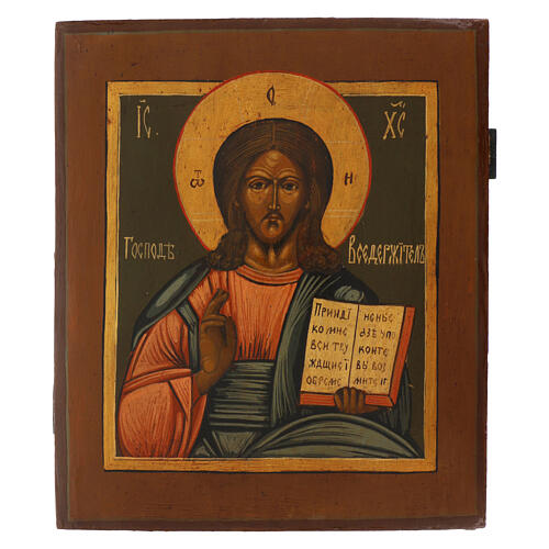 Antique Russian icon of Christ Pantocrator, typical of Byzantine art, depicting the most well-known Christological icon.