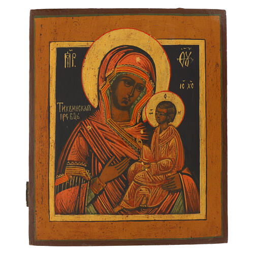 Hand-painted antique Russian icon of the Mother of God of Tichvin, restored with gold frame, 10x12 in. The icon of the Mother of God of Tichvin is one of the most famous sacred images in Russia. Its first recorded appearance near Novgorod was in 1383. This icon follows the Hodegetria style, where the Virgin Mary points to the Infant Jesus, symbolising the path to Christ as the way to salvation. A distinctive feature of this particular icon is Christ's gesture of blessing his mother with his right hand. It is believed that the first iconographer to paint an Hodegetria image was Saint Luke the Evangelist, making these representations among the oldest and most venerable images of the Mother of God. Subjects: Mother of God of Tichvin. Origin: Moscow, Russia. Technique: egg tempera. Materials: wood, levkas. Dimensions: 10.2x11.8 in. Era: 19th century, restored in the 21st century. The icon comes with a special protective case for transportation and includes a certified appraisal by an expert.