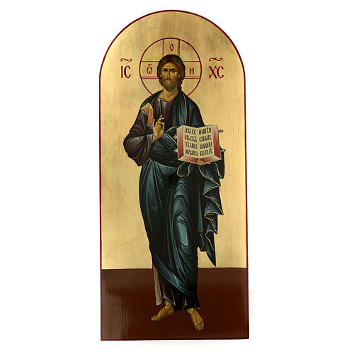 Christ Pantocrator Russian icon silk screen print 120x50 cm. Christ Pantocrator, from the Greek "sovereign of all things", is a depiction of Jesus typical of Byzantine art and is portrayed in the act of blessing with the three fingers of his right hand, according to the orthodox culture. The image of Christ is in silk screen while the golden background is painted by hand.