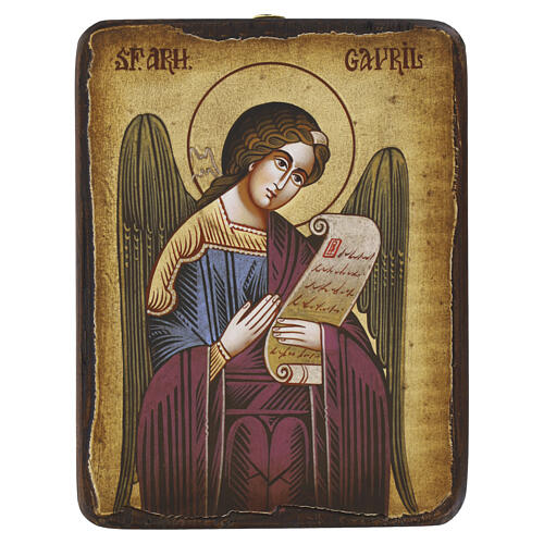 Hand-painted Romanian Archangel Gabriel icon, purple robe, 7.1x5.9 in, antiqued style.