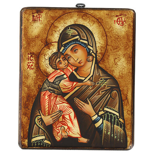 This icon was crafted by skilled Romanian iconographers following the Byzantine tradition. Highly revered in Russia, it depicts the Theotokos and the Infant Jesus in a gesture of profound tenderness. Mary, with a gaze filled with love and sorrow, foresees the destiny of Jesus, who, in an act of affection and comfort, gently embraces his Mother and leans his face against hers, acknowledging the pain his mission will bring.