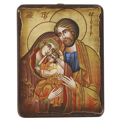 Romanian painted icon of the Holy Family, antiqued style, 7.1x5.9 in.