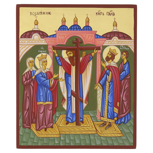 Sacred icon executed by hand according to the canons of Russian iconography, painted on linden wood with egg tempera and gold leaf. The scene shows Bishop Macarius of Jerusalem at the centre, standing on a pulpit and lifting the True Cross to present it to the faithful.