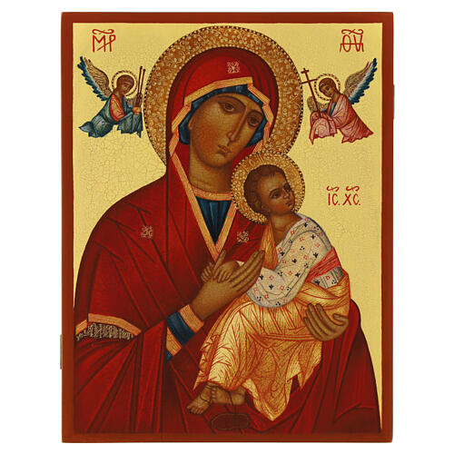 Russian painted icon of Our Lady of Perpetual Help 21x17 cm. Modern icon of Our Lady of Perpetual Help painted by hand on a 21x17 cm lime wood board in Russia following the rules of Byzantine-Russian school. The icon has an antique finish and is covered in gold leaf.