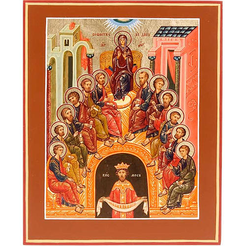 Icon of the Pentecost: an image of the curch that is always open to everybody. The church welcomes people, day after day, year after year, century after century. Mary is in prayer with apostles, and they have a roll in their hands, the symbol of the teaching of God. This icon is entirely hand-painted by the Yaroslav atelier, following the rules of the Orthodox iconic tradition. The slight imperfections that can be visible on the icon bear witness to the craftsmanship process. This icon comes in ...