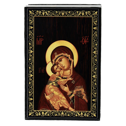 Russian box with lacquer of Our Lady of Vladimir, 3.5x2.4 inches. Papier-maché box handmade in Russia with a processed image applied and finished with a mixed technique of painting and découpage.