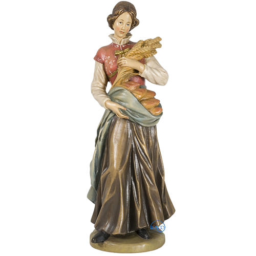 Saint Notburga with ears of wheat and loaves in painted Valgardena wood.