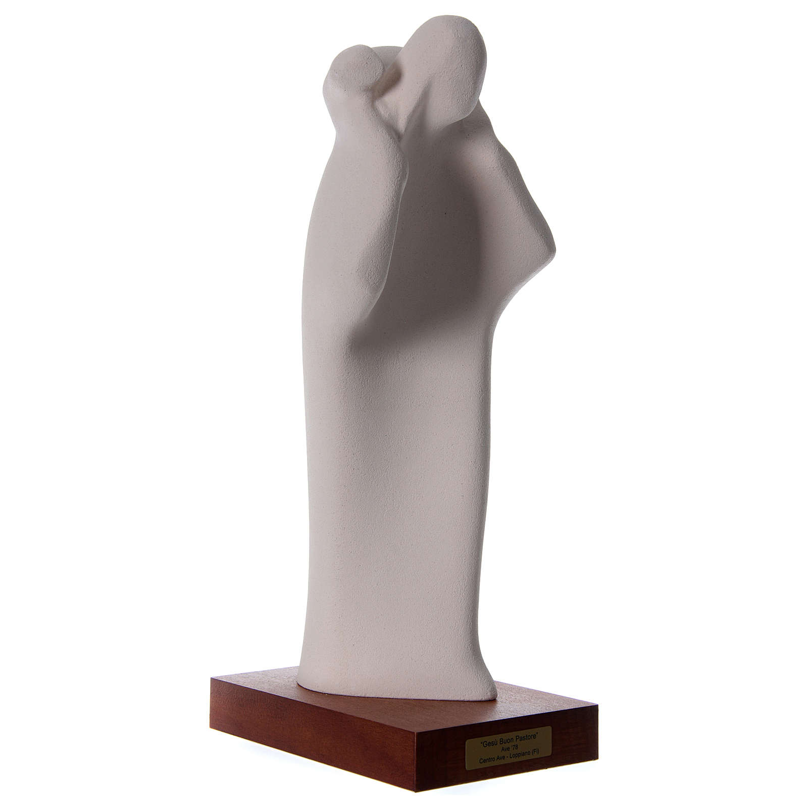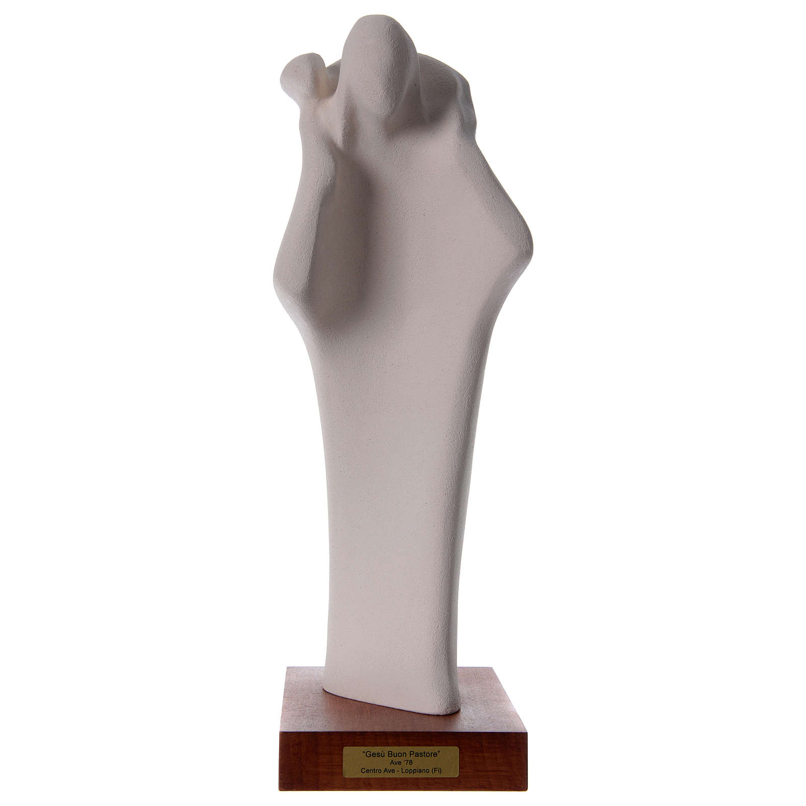 The Good Shepherd statue made of fire clay with wooden base. Fire clay statue depicting The Good Shepherd. Completely hand made in italy.