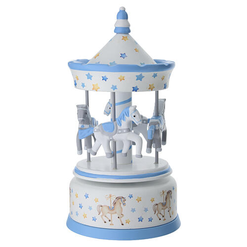 Music box favour shaped like a carousel with wooden horses and a blue finish. The structure features a roof decorated with small blue and yellow stars, shaped horses with sky-blue details, and a matching cylindrical base.
